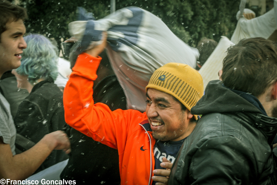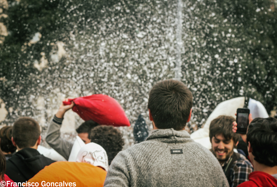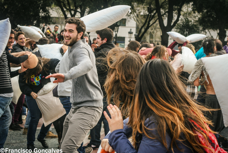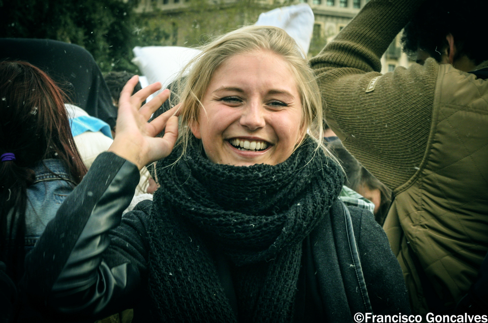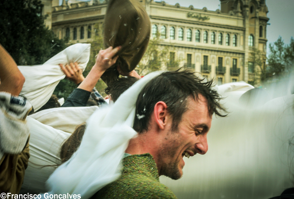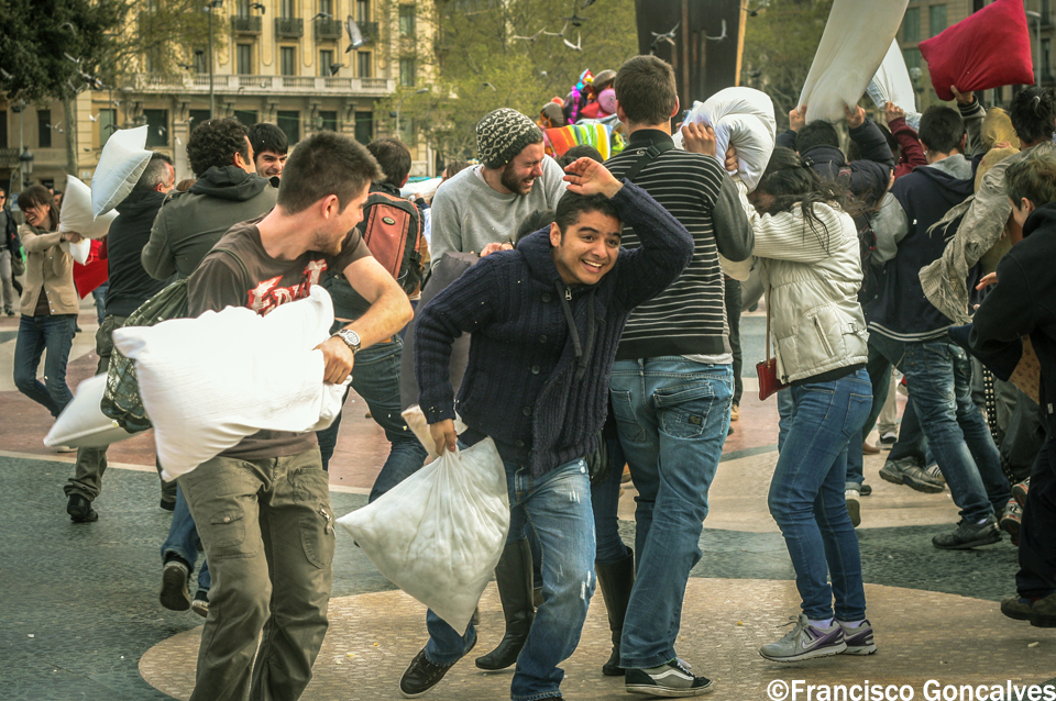 Like all the years, hundreds of “warriors” gathered at Plaça Catalunya to celebrate the traditional Pillow Fight, a world flashmob that takes place in lots of cities at the same day.Unlike previous editions, this time I didn’t think of going, but for a last time change of plans I had to pass by the plaza at the exact time when the event was taking place! The only bad time is that only had with me my “small” camera with the  .50mm lens and I just could stay only for a few minutes… but even so it was great and I can’t wait to participate in the 2014 edition!