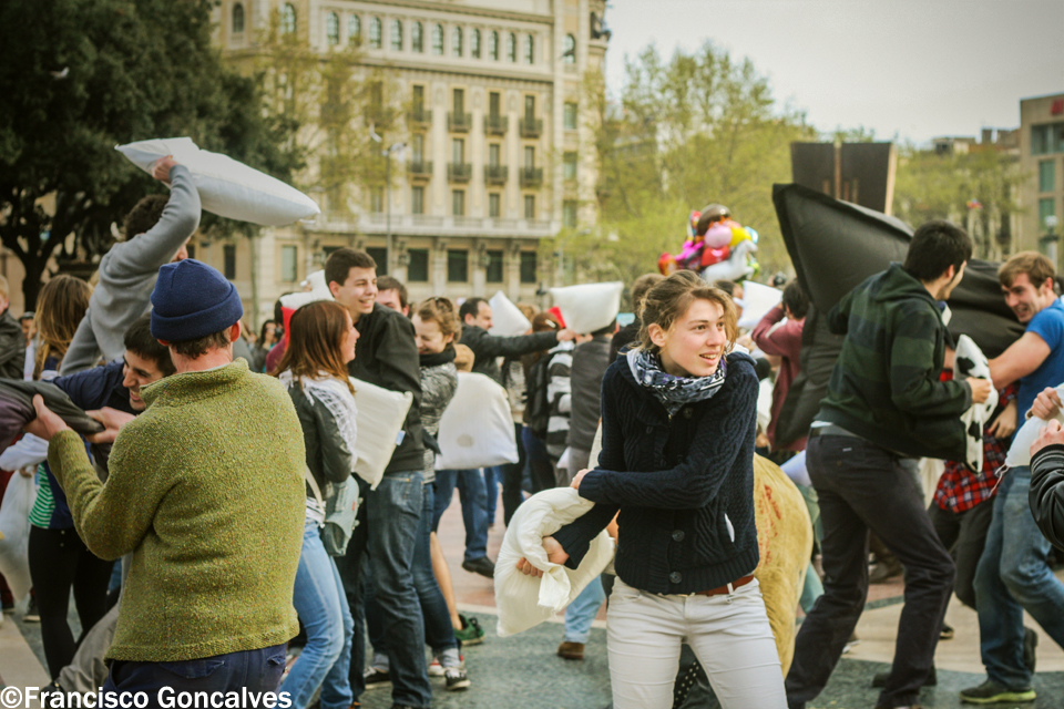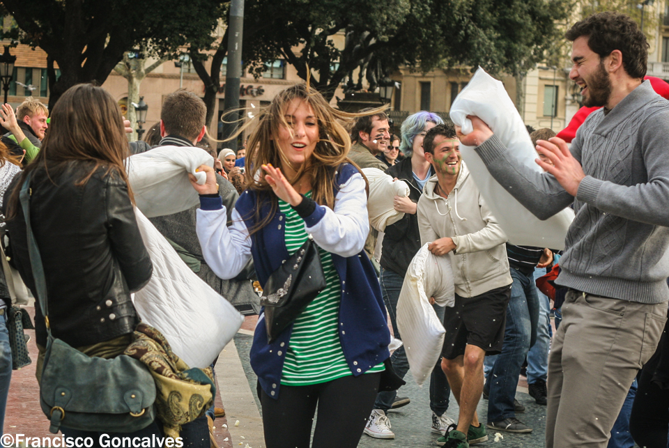 Como todos los años, cientos de “guerreros” se reunieron en la Plaça Catalunya para celebrar la tradicional Guerra de Almohadas o Pillow Fight, un flashmob mundial que se realiza en muchas ciudades el mismo día. A diferencia de ediciones anteriores, esta vez no tenía pensado ir, ¡pero por un cambio de planes a última hora tuve que pasar por la plaza justo a la hora del evento! Lo único malo es que tenía mi cámara “pequeña” con el .50mm y sólo pude quedarme unos pocos minutos… ¡pero aún así estuvo genial y ya espero participar en la del 2014!